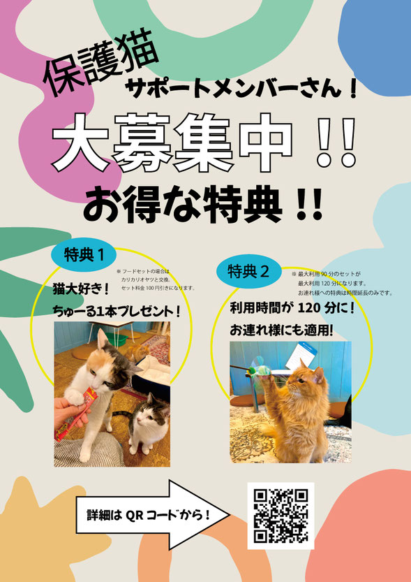 保護猫カフェの維持には経費がとてもかかります、そこでサポートして頂けるメンバーさんを募集しております。たくさんの保護猫たちが里親さんと出会える場所で有り続ける為に、皆様のサポートをお待ちしています。下記URLから支援型サブスクリプションのページをご覧ください。